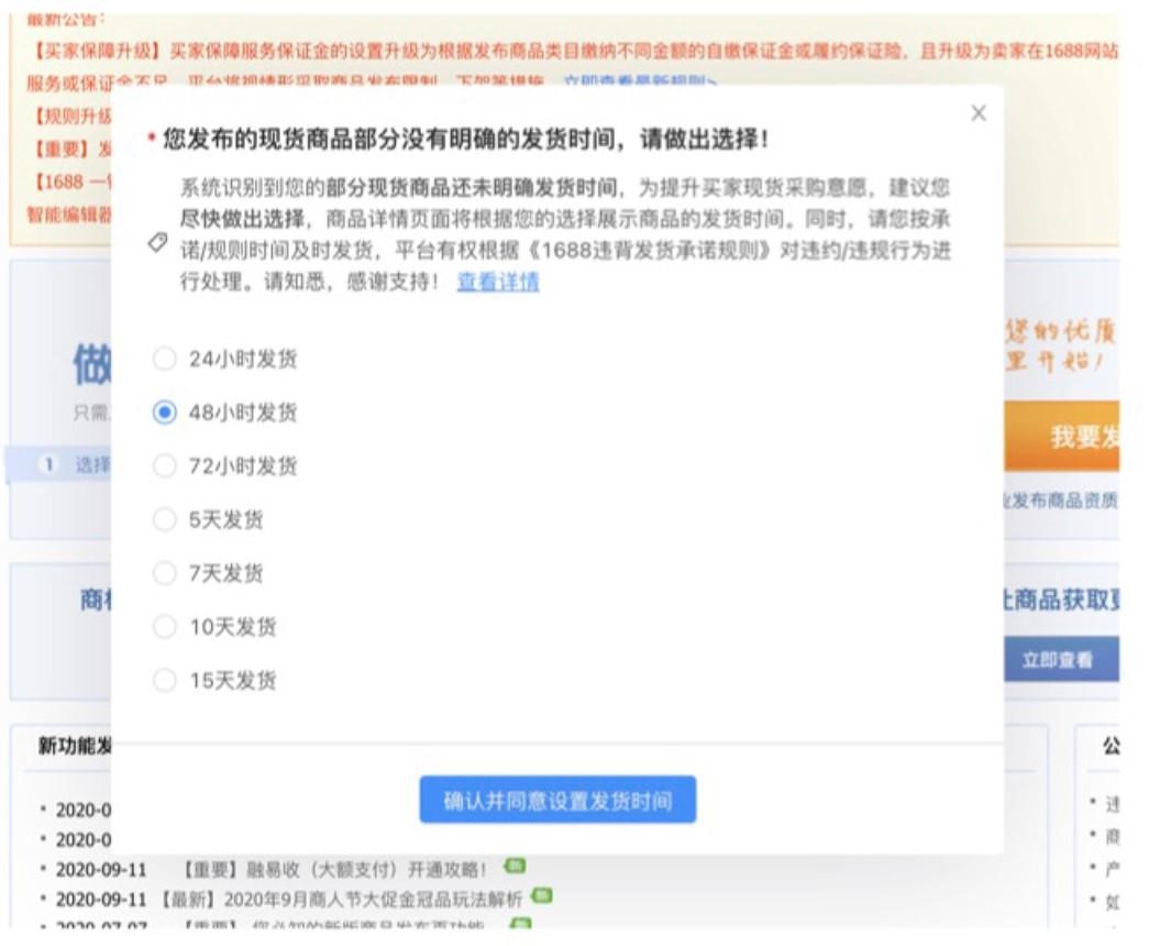 1):公告正式開始後,賣家工作台【商品管理】和【訂單管理】頁面将有彈窗(chuāng)(僅一次)提示您選擇可(kě)完成的發貨時間。您選擇後,8月将會統一根據您選擇的時間顯示在商品頁面。