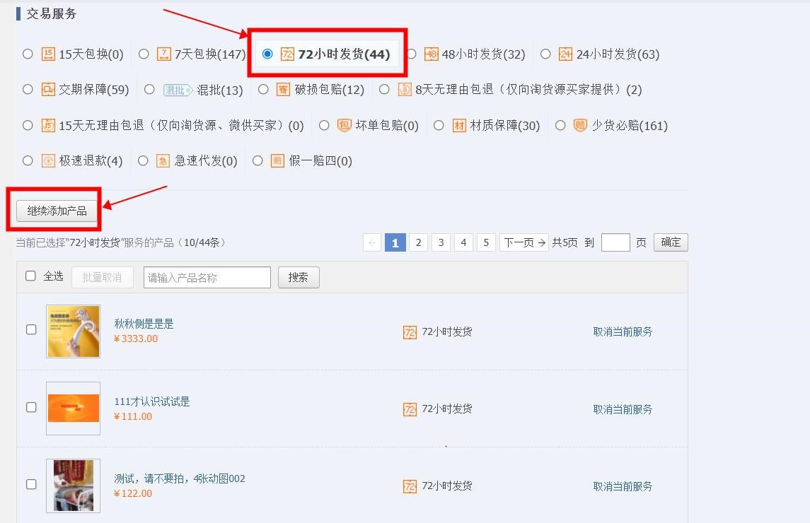 2):商家進入賣家工作台,搜索"商品管理""選擇相(xiàng)應的發貨時間"如(rú)(72小時發貨)"繼續添加商品""勾選響應商品""添加"(該功能僅支持開通買家保障服務的商家勾選)8月後續會增加5天/7天/10天/15天的批量設置。