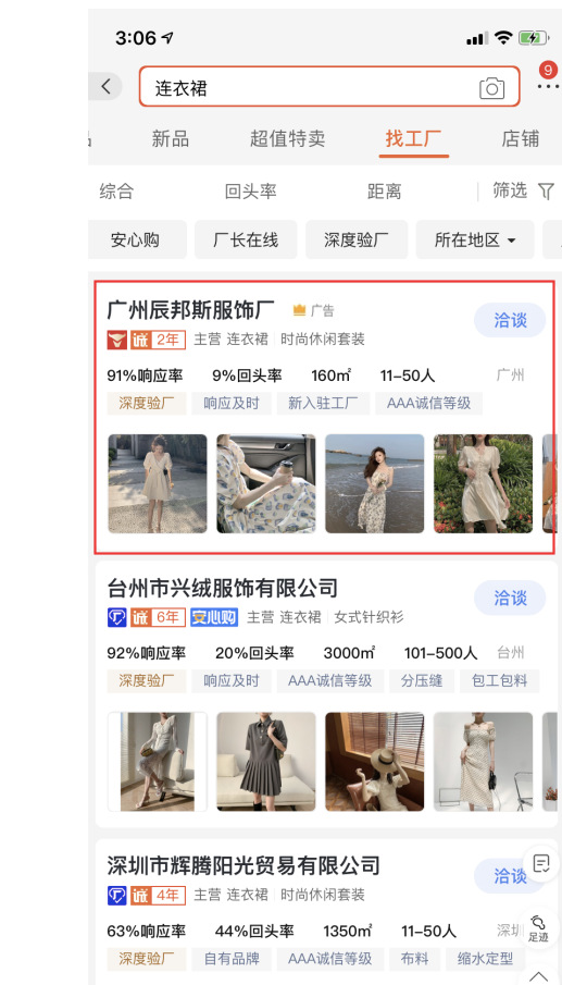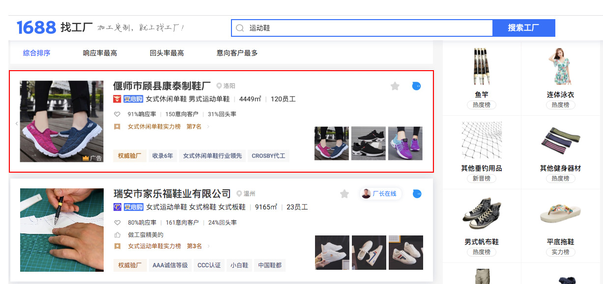 1688找工廠(chǎng)頻道PC端搜索結果第一位,且帶有皇冠标志
