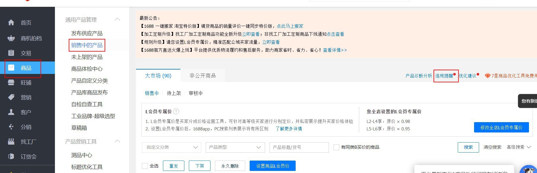 3、若提示違規已下架,需要在哪個入口進行修改上架?