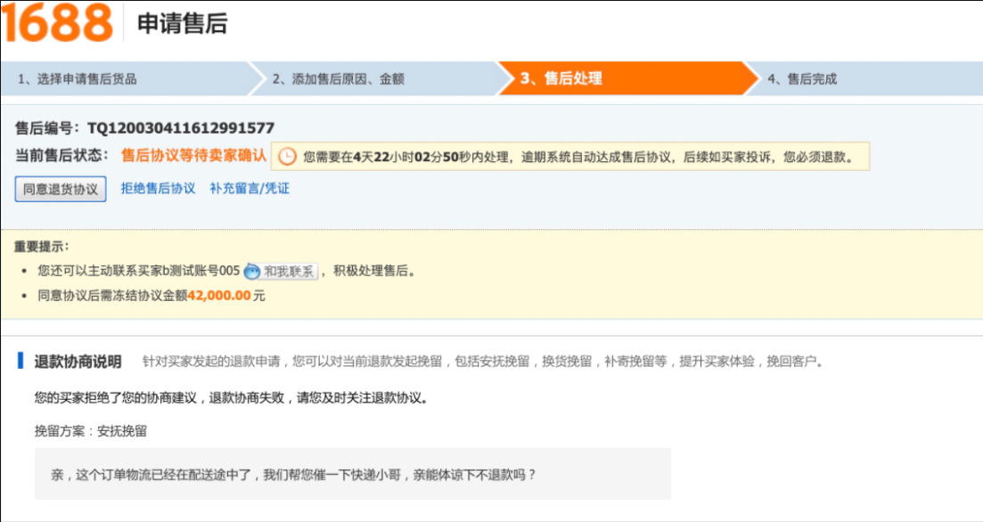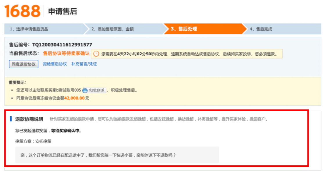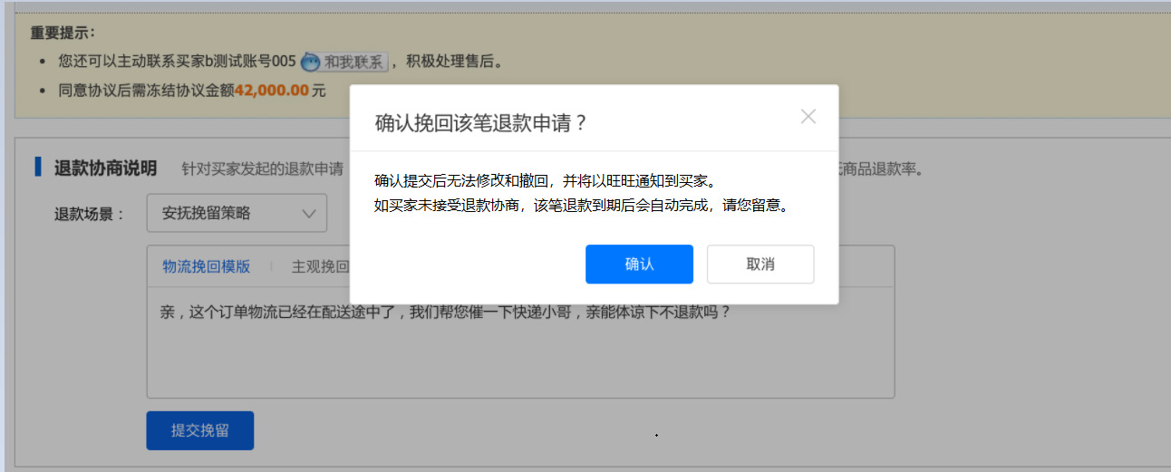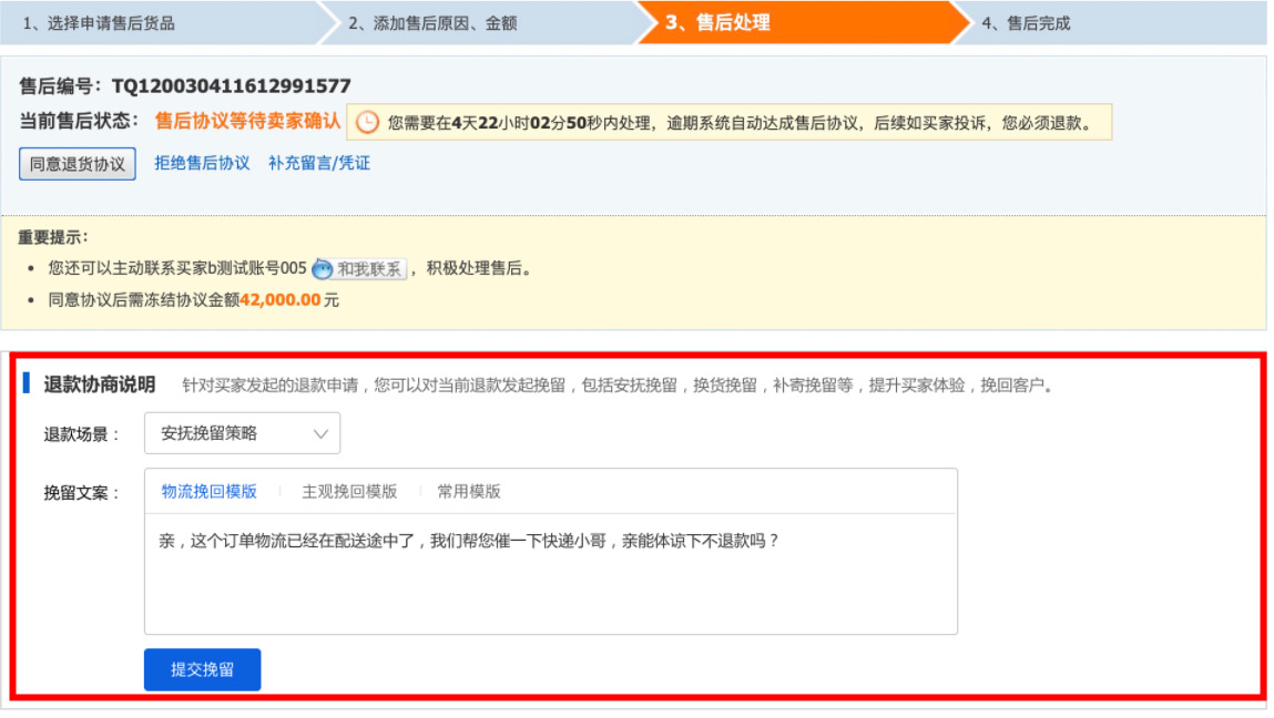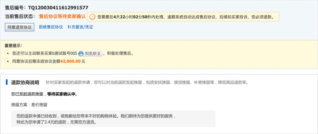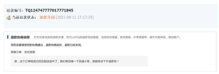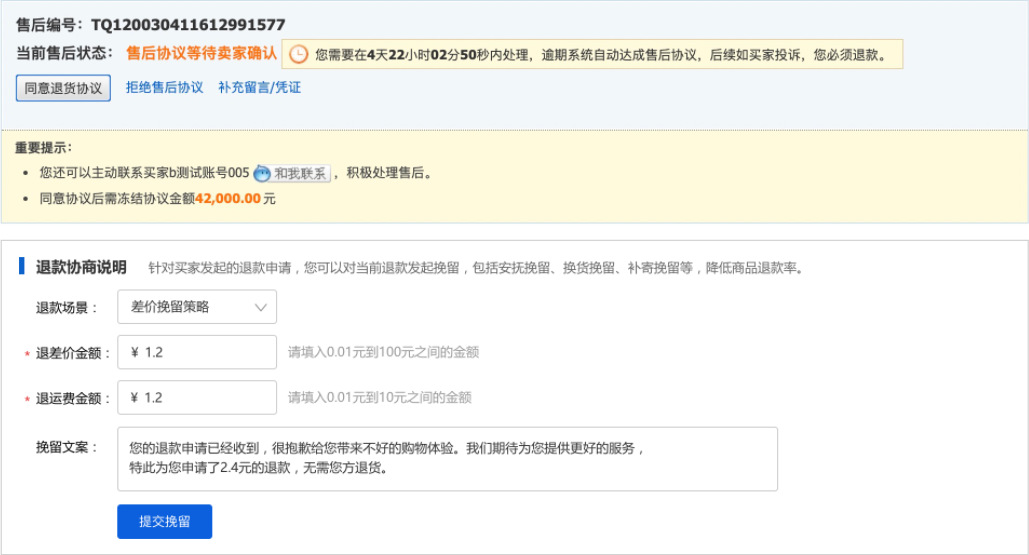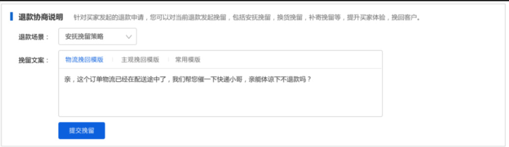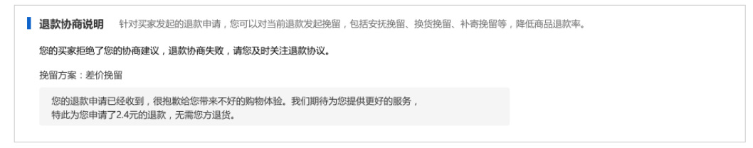 一. 寫在最前面,你真的在賺錢嘛?流量的成本越來(lái)越高,買家要求越來(lái)越高,在這個存量經營時代,爲什麽賣了很多貨,卻沒有賺很多?答案就(jiù)在退款裡,每一筆退款帶來(lái)的隐形成本太高。一筆退款的顯性成本=銷售額的損失隐形成本=退換貨的快遞費+售後客服的工資+商品的咨詢+客戶流失......銷售額的增長确實很重要,但(dàn)是【退款】已經逐漸成爲越來(lái)越多商家所關注的指标,在此背景下,商家退款協商工具應運而生。爲商家提供平台化、數據化、線索可(kě)追蹤化的退款協商産品及退款解決方案,這是我們一直所探索的事(shì)情。本操作指南(nán),即是幫助大家解讀(dú)退款協商産品體(tǐ)系,以及如(rú)何利用這些功能幫助商家進行更高質量的店鋪運營。 二. 産品怎麽開通,在哪裡能夠找到目前該産品隻針對實力商家開通,而且完全免費,沒有開通的商家,不要着急哦!(會陸續開放(fàng)更多的商家和功能,敬請(qǐng)期待!)有一天,當你焦躁的處理退款單時,發現退款單神奇的出現如(rú)下闆塊:親,您的退款單可(kě)以協商挽回了,開不開心!!! 三. 商家退款協商操作流程1.打開賣家後台左側點擊【交易】————【退貨退款管理】2.選擇退款類型選擇【售中】,【僅退款(已發貨)】或者【退貨退款(已發貨)】的退款單小二提示:隻有已發貨,且是售中訂單才可(kě)以協商挽回!(未發貨退款買家要退就(jiù)退吧(ba),攔又攔不住)3.點擊退款單若退款單中出現了【退款協商說(shuō)明】闆塊,這筆退款就(jiù)可(kě)以被協商挽回了。目前我們支持2種協商挽回方式:安撫挽回,差價挽回(換貨挽回,補寄挽回等正在全力開發中)4.選擇合适的挽回方式以安慰挽留舉例,可(kě)在挽留文案處編輯你的挽留留言(不超過50字)如(rú):【物流原因】親,這個訂單我們看物流已經在配送途中了,我們幫您催一下快遞小哥,親能體(tǐ)諒下不退款嗎(ma)?如(rú):【買家主觀原因】親,這款産品是我們店鋪的鎮店之寶呢(ne),您可(kě)以試試看哦!後面有問(wèn)題都(dōu)可(kě)以聯系我解決滴。5.點擊提交挽留,再次點擊确認6.遞交挽留後,耐心等待買家的反饋提示:退款協商挽回一旦提交,我們商家就(jiù)無法修改挽回方案,但(dàn)是您還(hái)可(kě)以正常處理退款。 7.買家端反饋7.1 如(rú)買家接受了您的退款協商方案退款單會自動關閉,走正常的交易超時機制。7.2 如(rú)買家拒絕了您的退款協商方案退款協商方案關閉,請(qǐng)您正常處理退款單。8. 差價挽回操作流程1.選擇【差價挽留策略】————【填寫金額】————【提交挽留】2.等待買家響應處理3.1:如(rú)買家接受,部分(fēn)退款成功,退款單完結,該筆訂單無法再次發起退款。3.2:如(rú)買家拒絕,退款協商失敗,請(qǐng)正常處理退款單。 四.【商家必備】如(rú)何利用好退款協商工具當買家因爲物流,配送等問(wèn)題發起退款,可(kě)以考慮使用【安撫協商】編輯好合适的文案,挽回客戶據調研,50%以上因爲物流原因發起的退款,是可(kě)以通過商家的安撫來(lái)進行挽救的收到貨後,買家因爲商品小瑕疵或者包裝破損,想要發起退貨時,建議(yì)嘗試使用【差價挽留】進行挽回有的商家習慣通過支付寶、第三方紅(hóng)包的形式給買家返差價,但(dàn)這樣産生糾紛時,我們是沒有任何線上的線索可(kě)追溯的。通過挽留工具,産生糾紛時,可(kě)以直接在後台看到和買家的協商記錄了!不需要反複舉證,耗時耗力。 五.常見(jiàn)問(wèn)題答疑Q: 産品是免費的嘛?A:重要的事(shì)情說(shuō)3遍,産品完全免費!免費!免費!Q:什麽時候開放(fàng)退款協商工具A:預計(jì)本周内開放(fàng),敬請(qǐng)期待!Q:是所有訂單都(dōu)可(kě)以協商挽回嘛?A:考慮到用戶體(tǐ)驗,我們會在售中已經發貨的訂單開放(fàng)協商挽回入口。Q:我不是實力商家,我能使用嘛?A:請(qǐng)您耐心等待,會陸續開放(fàng)更多的商家和協商挽回方案的。