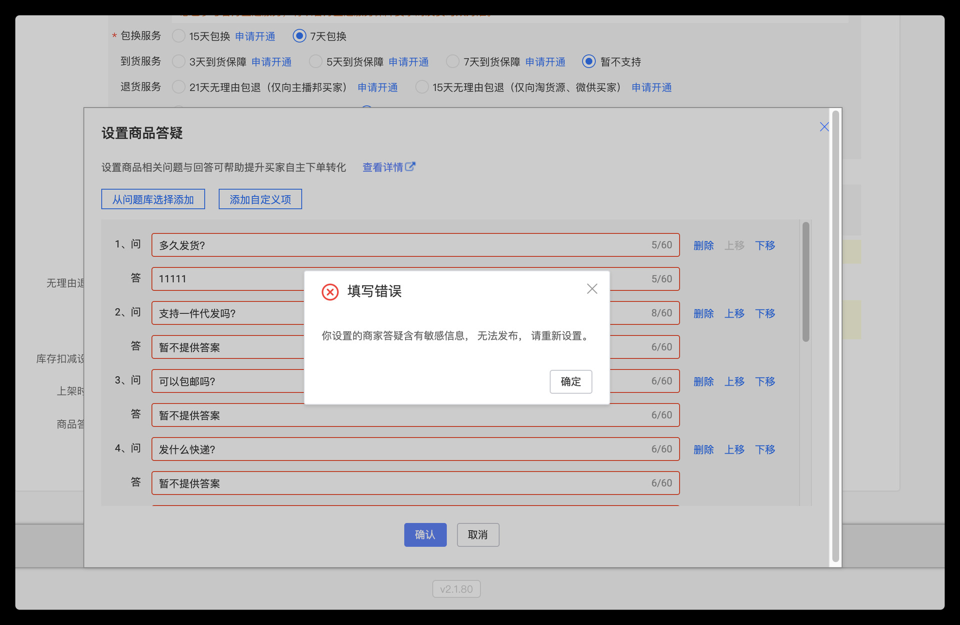 填寫的問(wèn)題和答案都(dōu)會經過審核才生效,一般審核時間都(dōu)在4小時以内完成,審核不通過的問(wèn)答不會在商品詳情展示,下次點擊進入答疑設置時審核不通過的問(wèn)題及問(wèn)答會出現彈窗(chuāng)和紅(hóng)色提醒。填寫規範: