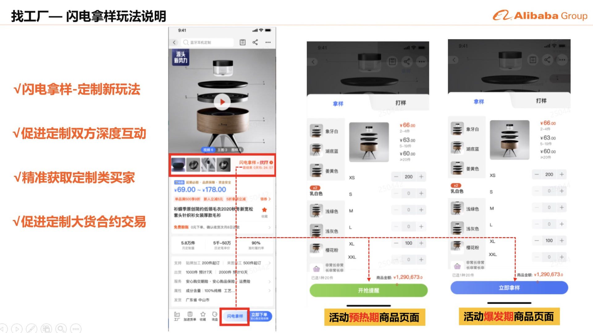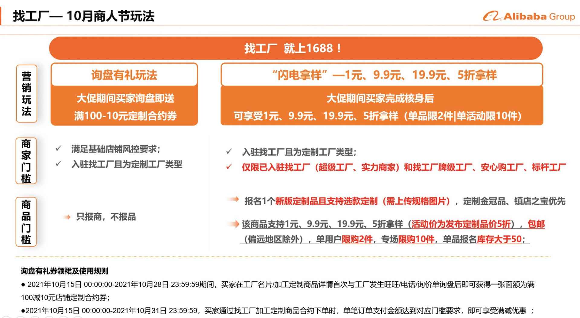 一、找工廠(chǎng)閃電拿樣新玩法10月商人節我們推出閃電拿樣新玩法,目标通過線上規劃化用戶運營,利用折扣樣品的的玩法,幫助工廠(chǎng)在大促期間獲取定制類買家(超200萬定制買家等你來(lái)),1個拿樣行爲,代表1個潛在定制生意,全面奠定年底旺季的生意基礎。二、找工廠(chǎng)10月大促營銷玩法主打閃電拿樣玩法,詢盤有禮爲基礎玩法,其中閃電拿樣限制商家門(mén)檻,詢盤有禮參與不限制商家門(mén)檻。三、找工廠(chǎng)10月商人節報名要求及入口專場類型:找工廠(chǎng)大促主會場報名要求:A.報名商家限僅限已經入駐找工廠(chǎng)(超級工廠(chǎng)、實力商家)和找工廠(chǎng)牌級工廠(chǎng)、安心購(gòu)工廠(chǎng)、标杆工廠(chǎng),同時報名需支持詢盤有禮玩法活動期間買家詢盤時,則獲得(de)1張該店鋪的合約交易券,券面額爲滿100-10元。B.報名1個新版定制品且支持選款定制(需上傳規格圖片),定制金冠品、鎮店之寶優先;該商品支持1元、9.9元、19.9元、5折拿樣(活動價爲發布定制品價5折),包郵(偏遠(yuǎn)地區除外),單用戶限購(gòu)2件(jiàn),專場限購(gòu)10件(jiàn),單品報名庫存大于50。【1元拿樣】報名入口:https://act.1688.com/home/calendarSelect.htm?tid=39260【9.9元拿樣】報名入口:https://act.1688.com/home/calendarSelect.htm?tid=39261【19.9拿樣】報名入口:https://act.1688.com/home/calendarSelect.htm?tid=39262【5折拿樣】報名入口:https://act.1688.com/home/calendarSelect.htm?tid=39259專場類型:找工廠(chǎng)大促外圍專場報名要求:商家必須入駐找工廠(chǎng)且爲定制工廠(chǎng)類型,同時報名需支持詢盤有禮玩法活動期間買家詢盤時,則獲得(de)1張該店鋪的合約交易券,券面額爲滿100-10元。報名入口:https://act.1688.com/home/topicDetail.htm?tid=39231四、閃電拿樣玩法和大促資源說(shuō)明1、商人節大促主會場、找工廠(chǎng)主會場、行業會場,定制賽道流量主推閃電拿樣報名商品;2、找工廠(chǎng)場景裡面,工廠(chǎng)名片、定制品詳情頁等資源将重點突出閃電拿樣;3、支付寶大促資源、夥拼頻道頁等站内外資源聯動,主推閃電拿樣;五、關于本次大促報名你可(kě)能疑惑的問(wèn)題?答:内圍專場僅限已經入駐找工廠(chǎng)(超級工廠(chǎng)、實力商家)和找工廠(chǎng)牌級工廠(chǎng)、安心購(gòu)工廠(chǎng)、标杆工廠(chǎng)報名,同時針對内圍商家來(lái)說(shuō),隻需報名内圍專場即可(kě)。答:不能,定制合約券隻能用于合約下單使用,僅限定制品。不與商人節期間店鋪其他(tā)任何優惠疊加,且不可(kě)使用在報名閃電拿樣的商品上。答:可(kě)以,使用不同定制品報名即可(kě);答:閃電拿樣4個專場,必須使用支持選款定制的定制品報名。