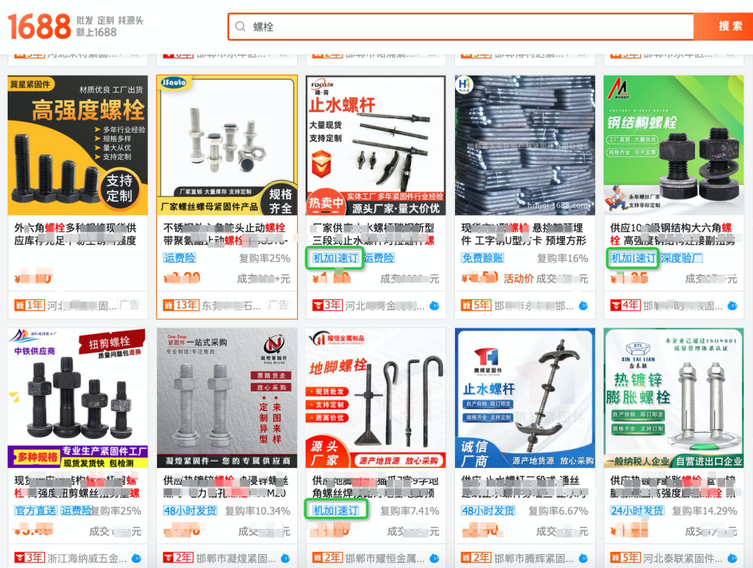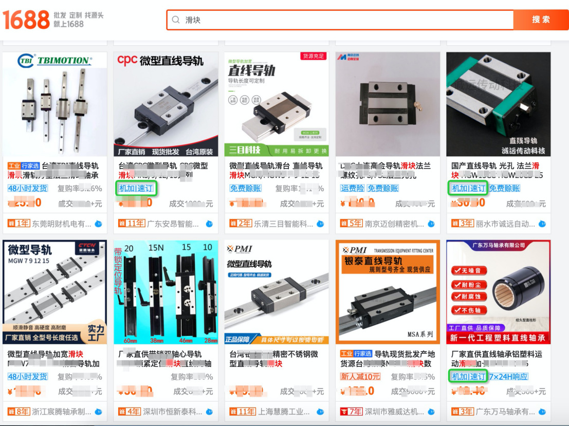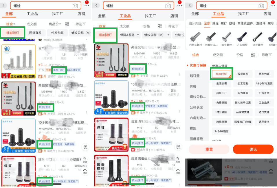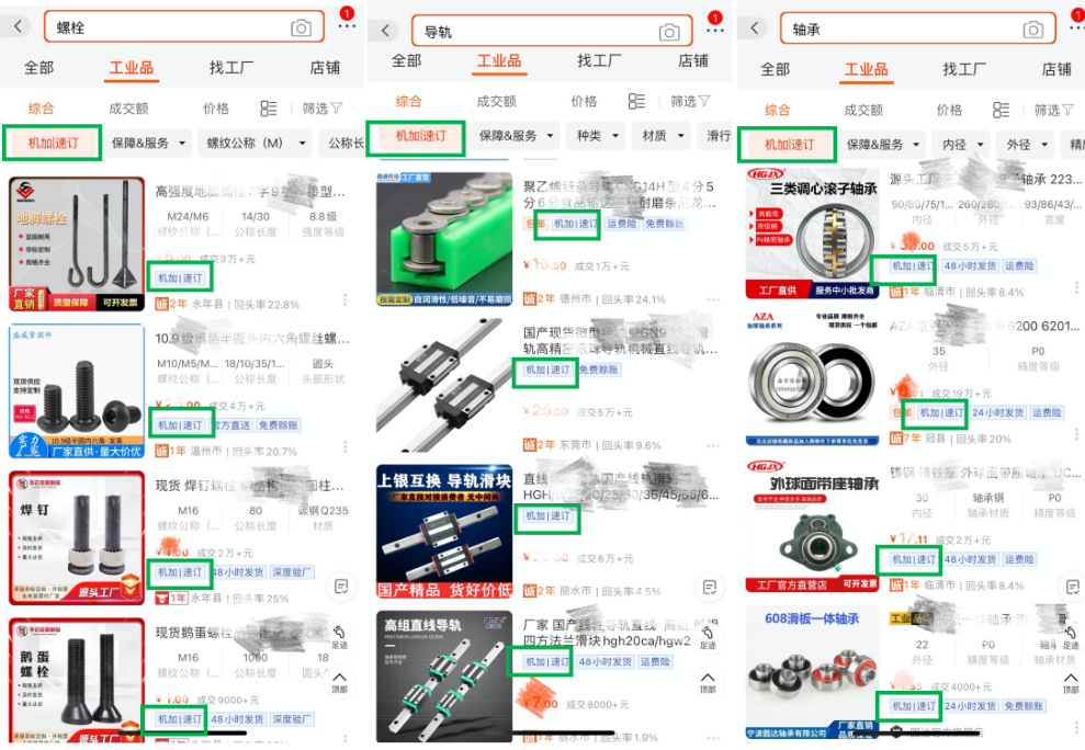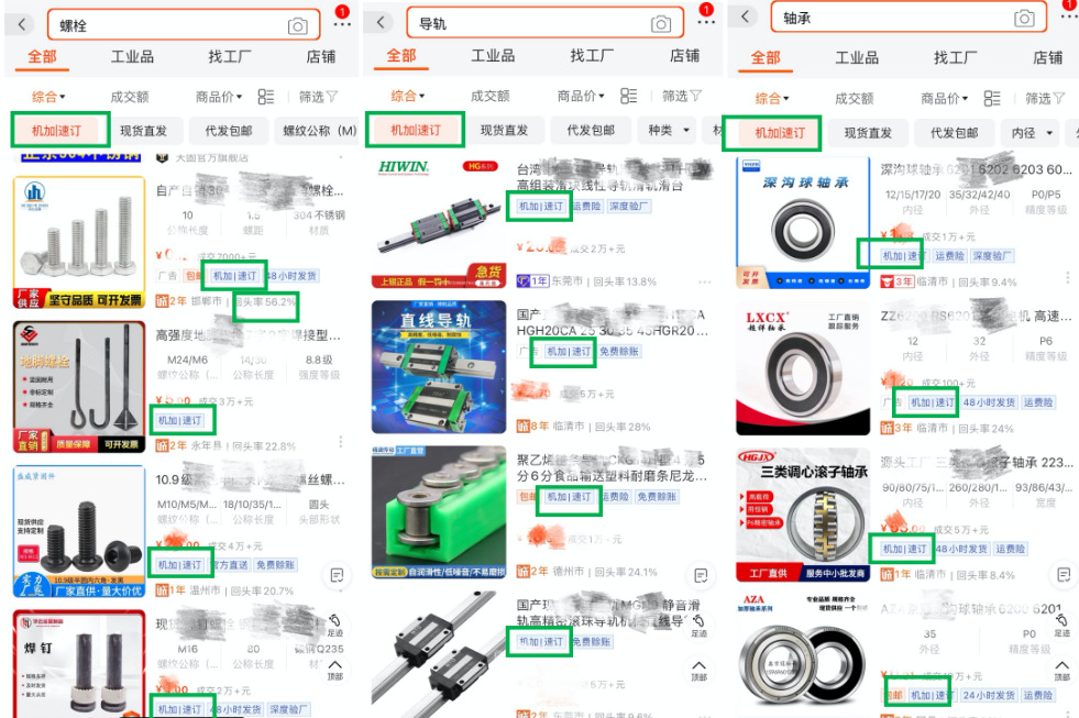 一、定義:"機加|速訂"爲存在機加工采購(gòu)需求的買家打造的小批量輕定制、快速響應、快速交貨,旨在幫助平台機加工買家提供更好的服務體(tǐ)驗。 二、“機加|速訂”入選及汰換規則:2.1 商家身份指标:系統判斷爲工廠(chǎng)身份,且主營類目滿足傳動件(jiàn),軸承及附屬件(jiàn),緊固件(jiàn)、連接件(jiàn),機械五金加工,模型、手闆之一。2.2 商品指标:商品類目滿足傳動件(jiàn),軸承及附屬件(jiàn),緊固件(jiàn)、連接件(jiàn),機械五金加工,模型、手闆之一;且商品星級爲5星及以上;商品最小起訂量=1;2.3 服務指标:商品勾選提供24小時/48小時/72小時/5天/7天/10天發貨服務,或勾選提供交期保障服務;商家近7天3分(fēn)鍾旺旺響應率60%。2.4 交易指标:商品近30天支付買家數大于等于1。2.5以上所有指标條件(jiàn)同時滿足則該商品自動成爲“機加|速訂”商品,數據每日(rì)更新,T+1生效。2.6若已成爲“機加|速訂”的商品不滿足上述任一條件(jiàn),則自動淘汰,數據每日(rì)更新,T+1生效。2.7 如(rú)商家存在以下一項或多項情形的,1688平台有權即時移除其商品的“機加|速訂”身份:2.7.1 因違法違規導緻其1688平台賬号被關閉的;2.7.2 本年度因違規累計(jì)扣分(fēn)超過36分(fēn)的;2.7.3 存在其他(tā)嚴重違反《阿裡巴巴中國站規則》的行爲。 三、“機加|速訂”權益:3.1 尊享“機加|速訂”專屬标簽,搜索list頁透傳,買家一眼識别,更信任、更高效的實現在線尋源采購(gòu)。無線全部貨源搜索:無線工業品搜索:PC搜索示意(找貨源和找工業品結果和效果相(xiàng)同):3.2 搜索篩選項透出“機加|速訂”專屬标簽,方便買家快速篩選,提升商品轉化可(kě)能。無線篩選示意:3.3 搜索場景,精準關鍵詞策略定向引流,創造精準買家定向引流機會。 四、1688平台有權根據實際需求調整或終止“機加|速訂”運營機制及規則,并以公告或通知告知商家。